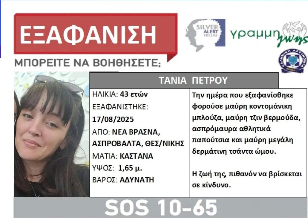Συναγερμός έχει σημάνει στις αρχές για την εξαφάνιση 43χρονης από την περιοχή των Νέων Βρασνών, στην Ασπροβάλτα Θεσσαλονίκης.  Πρόκειται για την Τάνια Πέτρου, η οποία εξαφανίστηκε το βράδυ της 17ης Αυγούστου. Η «Γραμμή Ζωής» ειδοποιήθηκε από τους οικείους της χθες το βράδυ και μετά τη συγκέντρωση των απαιτούμενων δικαιολογητικών, ενεργοποιεί τον Κοινωνικό Συναγερμό SILVER ALERT, για την κινητοποίηση όλων για την ανεύρεσή της. Σύμφωνα με τη «Γραμμή Ζωής», η ζωή τη, 43χρονης πιθανόν να βρίσκεται σε κίνδυνο.  Η 43χρονη έχει μαύρα μακριά μαλλιά με...