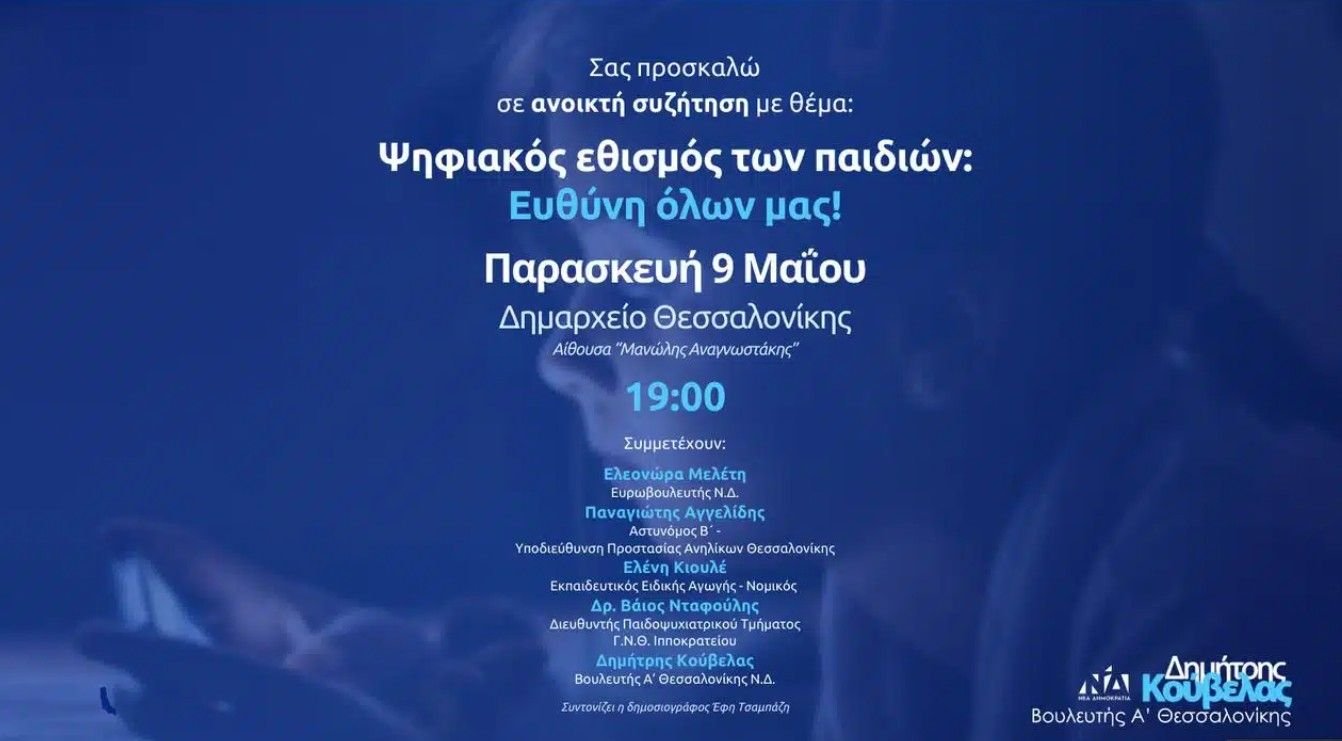 Την Παρασκευή 9 Μαΐου στις 19:00μ.μ. στην αίθουσα «Μανώλης Αναγνωστάκης», στο Δημαρχείο Θεσσαλονίκης έχει προγραμματιστεί εκδήλωση με θέμα «Ψηφιακός εθισμός των παιδιών: Ευθύνη όλων μας!».Στη συζήτηση θα συμμετέχουν : Ο Αστυνόμος Β´ Υποδιεύθυνση Προστασίας Ανηλίκων Θεσσαλονίκης Παναγιώτης Αγγελίδης, η Εκπαιδευτικός Ειδικής Αγωγής – Νομικός Ελένη Ι. Κιουλέ, η Ευρωβουλευτής της ΝΔ Ελεονώρα Μελέτη και ο Δρ. Βάιος Αχ. Νταφούλης, Διευθυντής Παιδοψυχιατρικού Τμήματος Γ.Ν.Θ. Ιπποκρατείου νοσοκομείου Θεσσαλονίκης.Ο Βουλευτής της ΝΔ και Αντιπρόεδρος της Επιτροπής Μορφωτικών...