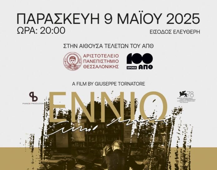 Το Τμήμα Κινηματογράφου του Αριστοτέλειου Πανεπιστημίου Θεσσαλονίκης και ο Πολιτιστικός Σύλλογος Φίλων Μουσικής Ennio Morricone Eλλάδας διοργανώνουν ανοικτή εκδήλωση προβολής του ντοκιμαντέρ του Τζιουζέπε Τορνατόρε «Ennio: The Maestro», την Παρασκευή 9 Μαΐου 2025 και ώρα 20.00, στην Aίθουσα Τελετών του ΑΠΘ.Το ντοκιμαντέρ «Ennio: The Maestro» (2021) του βραβευμένου με Όσκαρ δημιουργού του «Σινεμά ο Παράδεισος», Giuseppe Tornatore, παρουσιάζει τη ζωή και το έργο του Ennio Morricone μέσα από συνεντεύξεις, αρχειακό υλικό και προσωπικές αφηγήσεις του ίδιου του συνθέτη.Η είσοδος είναι...