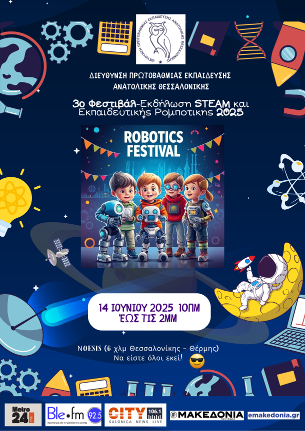 Δελτίο ΤύπουΤο Σάββατο στις 14 Ιουνίου 2025 ξεκινά το 3°Φεστιβάλ-Εκδήλωση Εκπαιδευτικής Ρομποτικής και STEAM 2025 το οποίο θα πραγματοποιηθεί στις εγκαταστάσεις του NOESIS (6 χλμ Θεσσαλονίκης – Θέρμης), που διοργανώνει η Διεύθυνση Πρωτοβάθμιας Εκπαίδευσης Ανατολικής Θεσσαλονίκης σε συνεργασία με το Αριστοτέλειο Πανεπιστήμιο Θεσσαλονίκης (Εργαστήριο Ψυχολογίας και Εκπαίδευσης του Παιδιού – ΨΥΧΗ, Τ.Ε.Π.Α.Ε, Π.Τ.Δ.Ε, Τμήμα Φιλοσοφίας και Παιδαγωγικής, Τμήμα Ψυχολογίας, & Τ.Ε.Φ.Α.Α) και την υποστήριξη της Περιφε…
