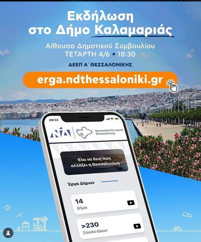 Έλα να δεις πώς αλλάζει η Θεσσαλονίκη», είναι το σύνθημα του προγράμματος ενημερωτικών εκδηλώσεων της Νέας Δημοκρατίας στη Θεσσαλονίκη , που πραγματοποιείται ανά Δήμους . Στην Καλαμαριά σήμερα Τετάρτη 4 Ιουνίου 2025, θα πραγματοποιηθεί ανοιχτή εκδήλωση προβολής του κυβερνητικού έργου, που διοργανώνεται από τη ΔΕΕΠ Α’ Θεσσαλονίκης. Η εκδήλωση θα λάβει χώρα στην αίθουσα του Δημοτικού Συμβουλίου Καλαμαριάς (Πλατεία Σκρα), στις 18:30, όπου θα παρουσιαστούν τα έργα που γίνονται στη Θεσσαλονίκη και το Δήμο Καλαμαριάς από την κυβέρνηση της Νέας Δημοκρατίας.