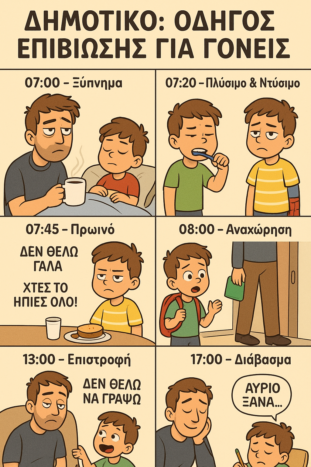 Ακολουθεί ο οδηγός επιβίωσης – σετ πρώτων βοηθειών για γονείς, γιατί όπως λέει και η λαϊκή ρήση: “Αν μεγαλώνεις παιδί δημοτικού και δεν έχεις πιει καφέ από καλαμάκι μέσα σε μπάνιο, δεν έχεις ζήσει πραγματικά.”