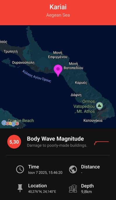 Σεισμός 5,3 Ρίχτερ στο Άγιο Όρος – Σε μικρή απόσταση από τις Καρυές το επίκεντρο