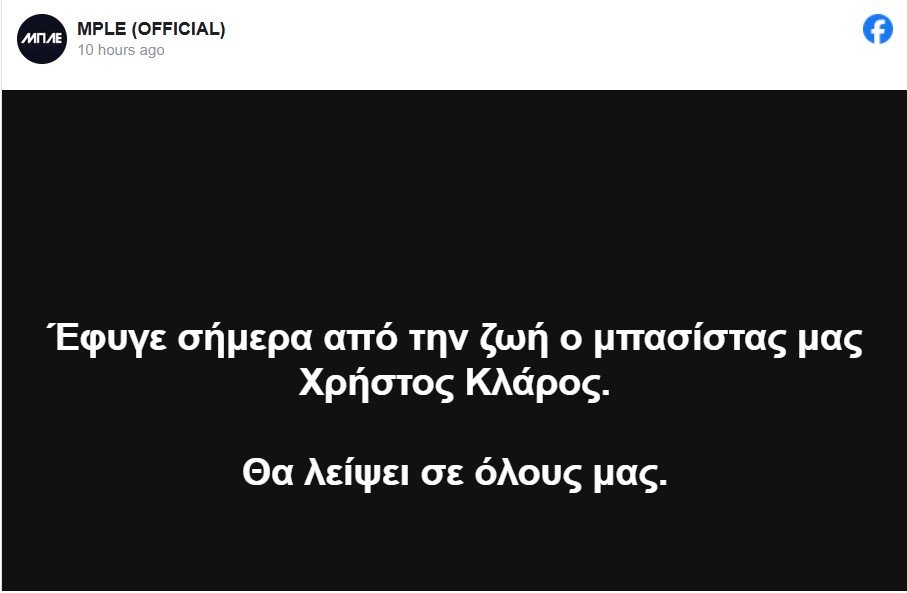 «Έφυγε σήμερα από τη ζωή ο μπασίστας μας Χρήστος Κλάρος. Θα λείψει σε όλους μας», είναι η ανάρτηση στο Facebook μέσα από την οποία έγινε γνωστή η θλιβερή είδηση.