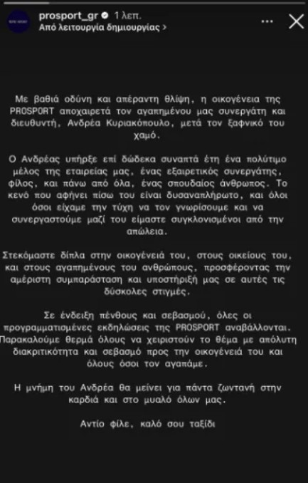 “Με βαθιά οδύνη και απέραντη θλίψη, η οικογένεια της PROSPORT αποχαιρετά τον αγαπημένου μας συνεργάτη και διευθυντή, Ανδρέα Κυριακόπουλο, μετά τον ξαφνικό του χαμό.