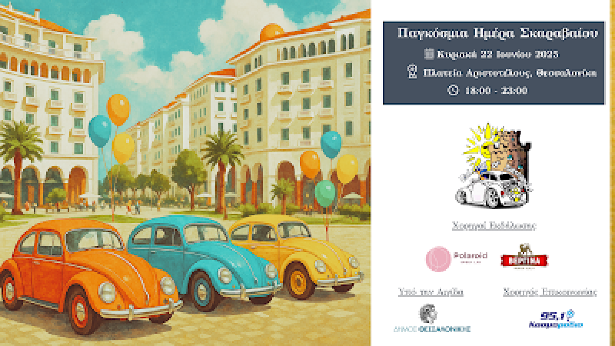Η Λέσχη Σκαραβαίου Θεσσαλονίκης σας προσκαλεί σε μια γιορτή γεμάτη νοσταλγία, μηχανοκίνητη ιστορία και ζωντανές στιγμές αλληλεπίδρασης. Με αφορμή την Παγκόσμια Ημέρα Σκαραβαίου, γιορτάζουμε την Κυριακή 22 Ιουνίου 2025 στην καρδιά της πόλης, την Πλατεία Αριστοτέλους, με μια μοναδική έκθεση κλασικών Volkswagen Beetle που θα σας ταξιδέψει σε άλλες εποχές!