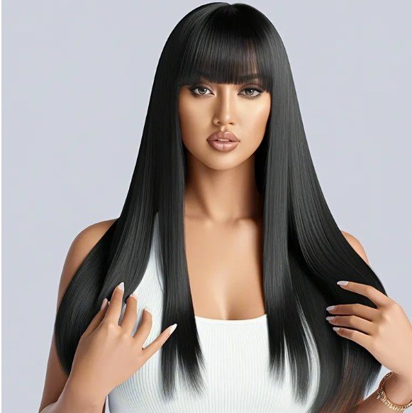 5.Κλασική Sleek Μακριά Περούκα με Wet Look και μακριά φράντζα
