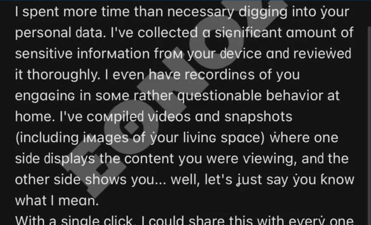 Το συγκεκριμένο e-mail έχει σαφώς εκβιαστικό χαρακτήρα, καθώς ο αποστολέας γράφει χαρακτηριστικά: «Αν καταλάβω ότι έχεις μιλήσει σε κανέναν για αυτό ή έψαξες για συμβουλή, το βίντεο θα σταλεί στις επαφές σου χωρίς δισταγμό».