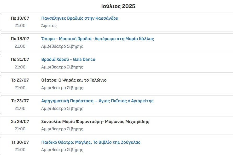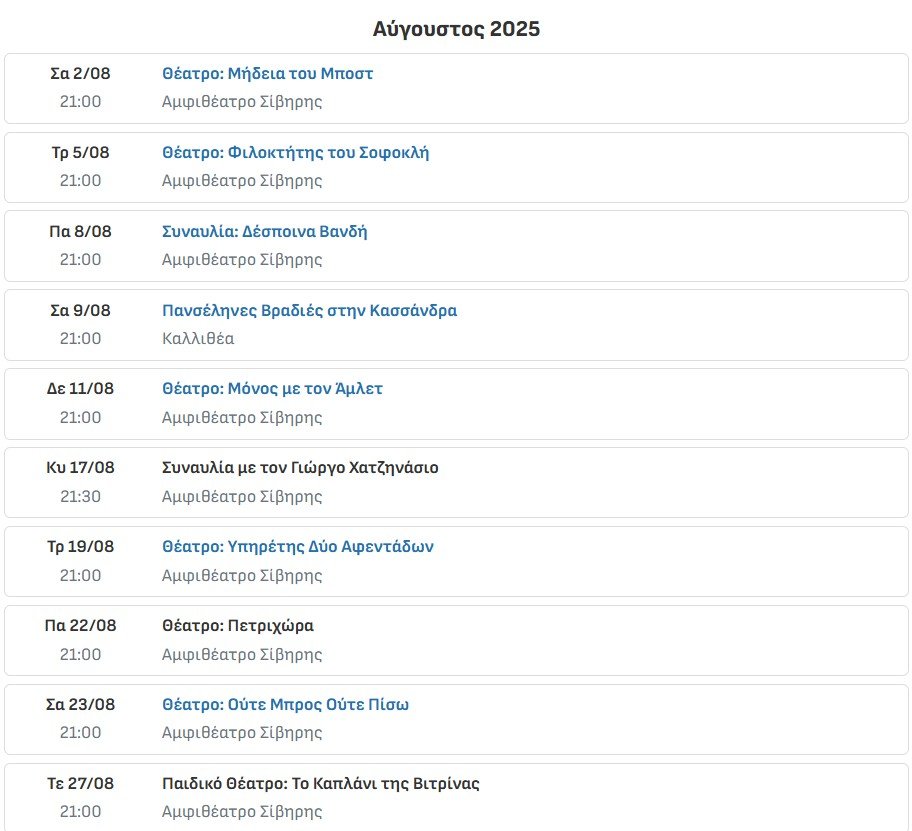 Από την Παρασκευή 18 Ιουλίου 2025 έως την Παρασκευή 29 Αυγούστου 2025, το Αμφιθέατρο Σίβηρης και η Κασσάνδρα γεμίζουν μουσικές, εικόνες και θεατρικούς παλμούς.
