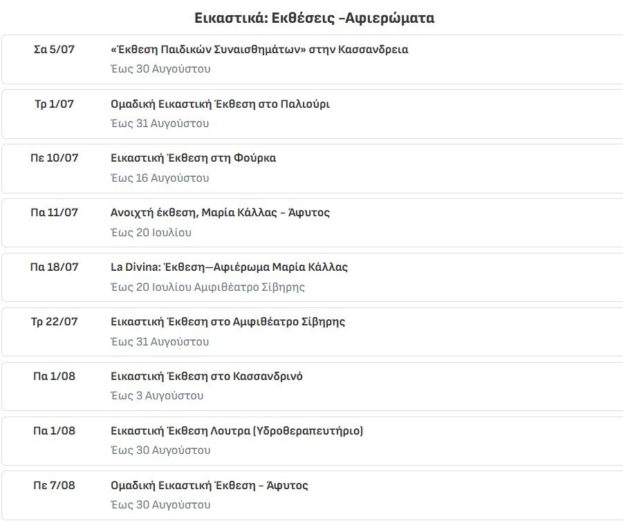 Παράλληλα, το πρόγραμμα εμπλουτίζεται με εικαστικές εκθέσεις, θεατρικές παραγωγές, συναυλίες, δράσεις σε υπαίθριους χώρους και μικρές πλατείες σε όλη την Κασσάνδρα. Σημαντικό κομμάτι της φετινής ταυτότητας είναι οι «Πανσέληνες Βραδιές», που υπόσχονται μια εμπειρία πέρα από την καθιερωμένη, με μουσική και ποίηση κάτω από το φως του φεγγαριού.