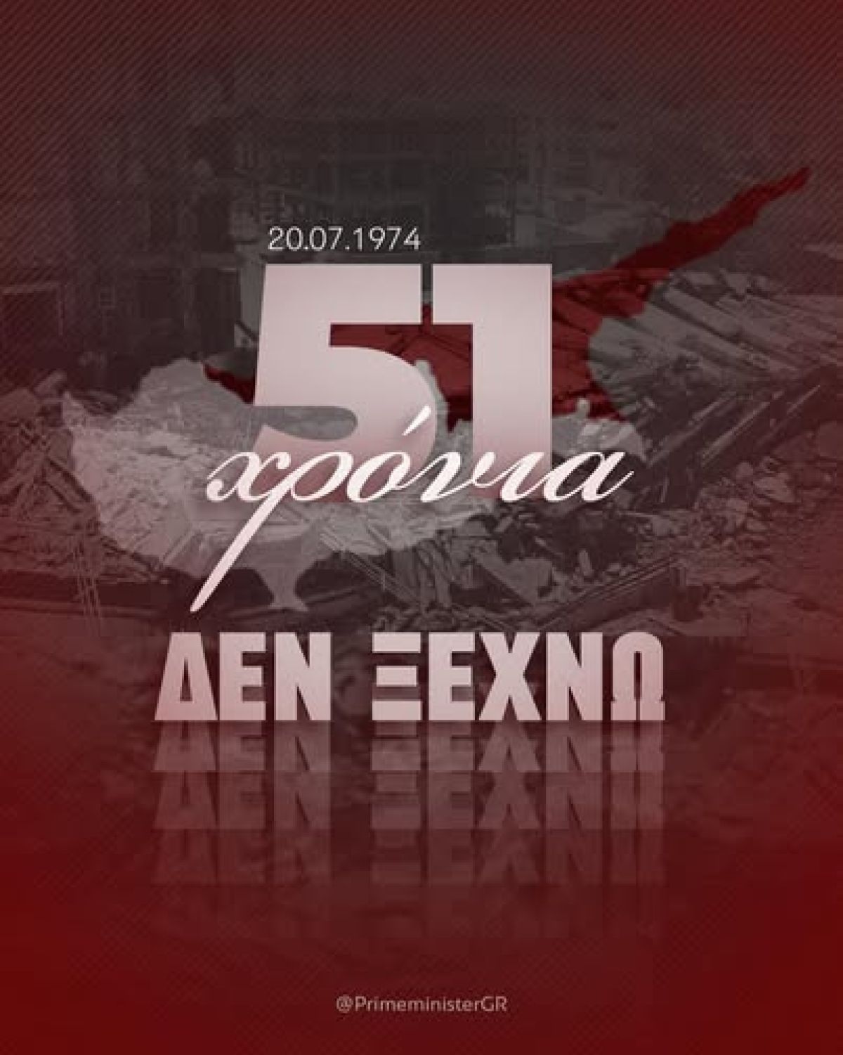 «Η μαύρη επέτειος της τουρκικής εισβολής στην Κύπρο πυροδοτεί και φέτος τη μνήμη της ωμής βίας, του χαμού και του ξεριζωμού. Δυναμώνει, ωστόσο, και τον αγώνα για την επανένωση του νησιού στο πλαίσιο ενός σύγχρονου ευρωπαϊκού κράτους. Χωρίς κατοχικές δυνάμεις. Και έτοιμο να αποτελέσει φάρο σταθερότητας και ειρήνης στις ταραγμένες θάλασσες της Ανατολικής Μεσογείου», αναφέρει ο πρωθυπουργός Κυριάκος Μητσοτάκης σε πρωινή ανάρτησή του στα μέσα κοινωνικής δικτύωσης με για τη συμπλήρωση 51 χρόνων από την τουρκική εισβολή στην Κύπρο.