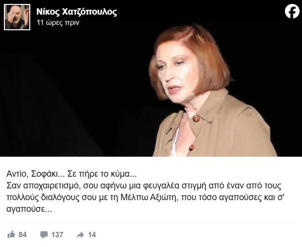 Τη δυσάρεστη είδηση επιβεβαίωσε ο ηθοποιός και φίλος της Νίκος Χατζόπουλος, ο οποίος σε ανάρτησή του στα μέσα κοινωνικής δικτύωσης έγραψε χαρακτηριστικά: “Αντίο, Σοφάκι… Σε πήρε το κύμα…“, ενώ την αποχαιρέτησε με “μια φευγαλέα στιγμή από έναν από τους πολλούς διαλόγους σου με τη Μέλπω Αξιώτη, που τόσο αγαπούσες και σ’ αγαπούσε…”.