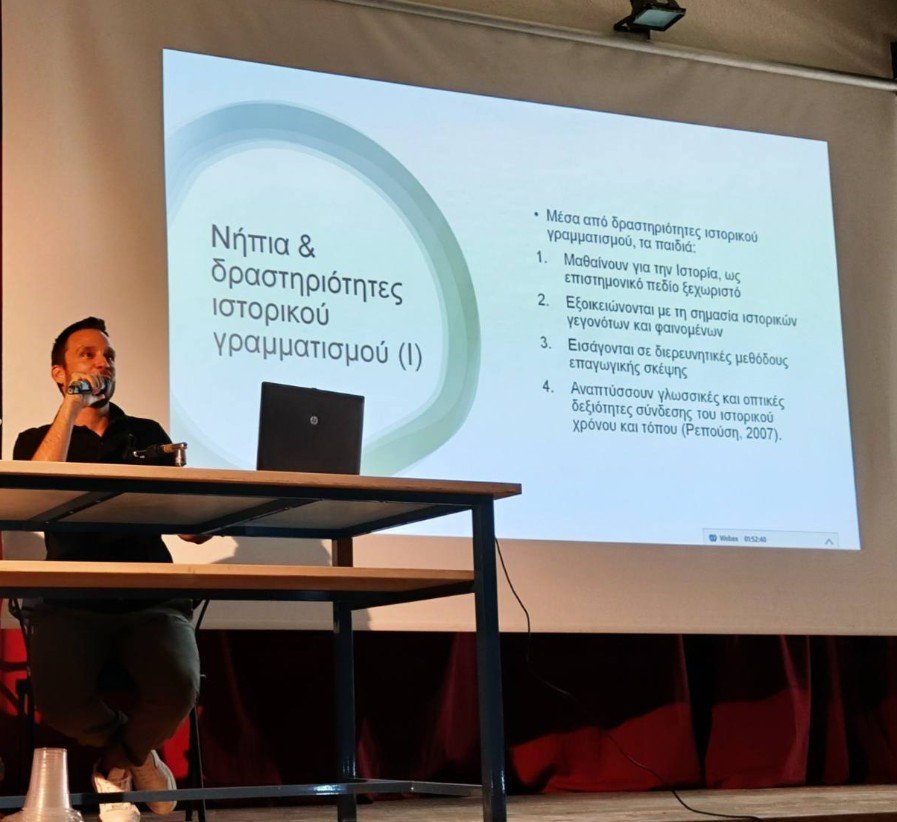 • Ο κ. Φίλιππος Μπρέντας, Εκπαιδευτικός ΠΕ60 – Ιστορικός, Υποψ. Διδάκτωρ Τοπικής Ιστορίας ΤΕΠΑΕ – ΑΠΘ, παρουσίασε το πώς η προσχολική αγωγή μπορεί να καλλιεργήσει τον ιστορικό γραμματισμό, με παράδειγμα διδακτικό σενάριο για τη Μακρόνησο.