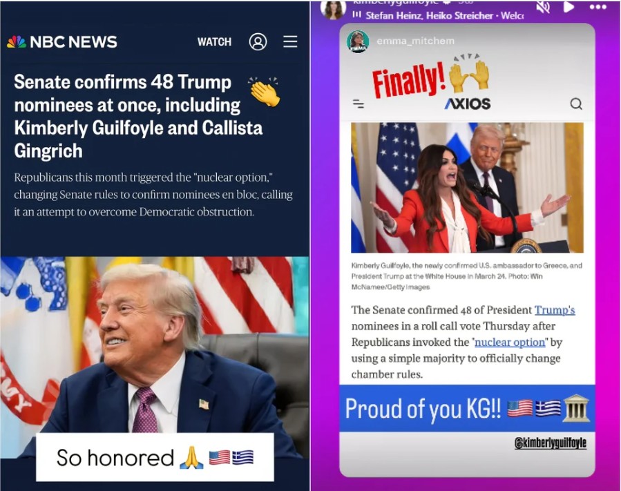 Παράλληλα, δημοσίευσε σε story την είδηση του NBC για την έγκριση του διορισμού της, συνοδεύοντάς τη με τις σημαίες Ελλάδας και ΗΠΑ, ενώ αναδημοσίευσε συγχαρητήρια μηνύματα, μεταξύ αυτών και της Έμμα Μίτσεμ, που σχολίασε «επιτέλους» πάνω από το σχετικό δημοσίευμα του Axios.