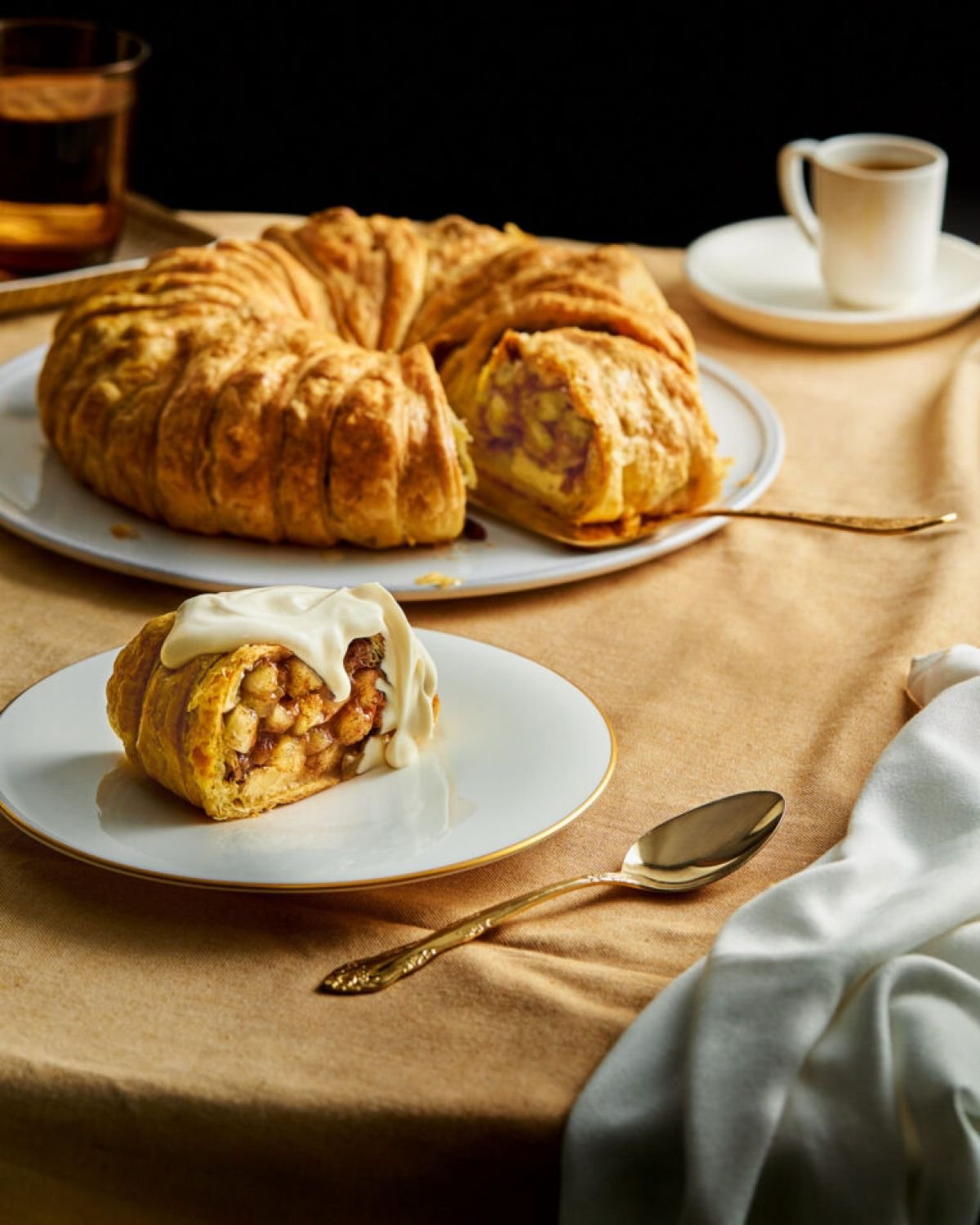 Απλώνουμε το ένα φύλλο σφολιάτας σε επίπεδη επιφάνεια και με ένα μαχαίρι κόβουμε κατά μήκος παραλληλόγραμμα κομμάτια με πλάτος περίπου 4 εκ. Κόβουμε λοξά κάθε κομμάτι από τη μία διαγώνια γωνία στην απέναντί της, σχηματίζοντας έτσι δύο μακριά τρίγωνα. Επαναλαμβάνουμε τη διαδικασία με τα άλλα δύο φύλλα σφολιάτας. Τώρα θα έχουμε άφθονα μακριά τριγωνικά κομμάτια. Βουτυρώνουμε μια φόρμα του κέικ με τρύπα στη μέση, διαμέτρου 28 εκ.