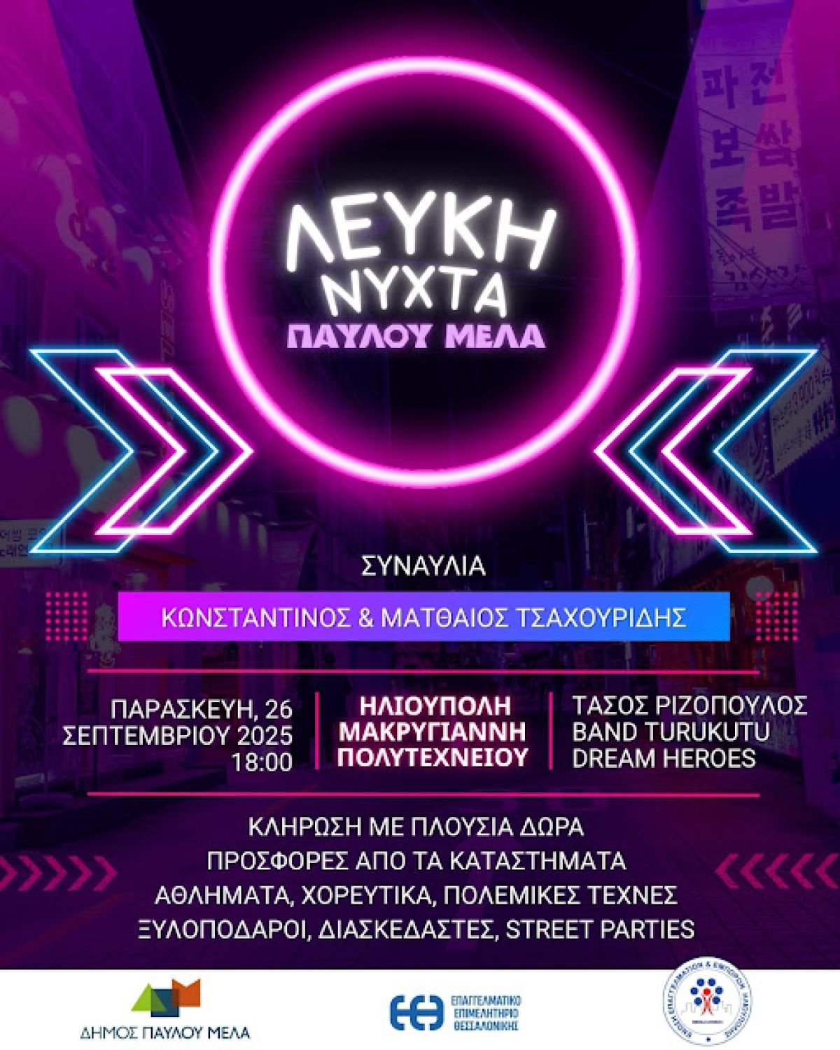 Η επιτυχημένη διοργάνωση της Λευκής Νύχτας επιστρέφει για δεύτερη συνεχή χρονιά στον Δήμο Παύλου Μελά και υπόσχεται να χαρίσει μια αξέχαστη εμπειρία σε μικρούς και μεγάλους. Απόψε, Παρασκευή 26 Σεπτεμβρίου, η καρδιά της πόλης θα χτυπά δυνατά στην Ηλιούπολη, με πλήθος εκδηλώσεων, εκπλήξεων και μουσική που θα κρατήσει μέχρι τα μεσάνυχτα.