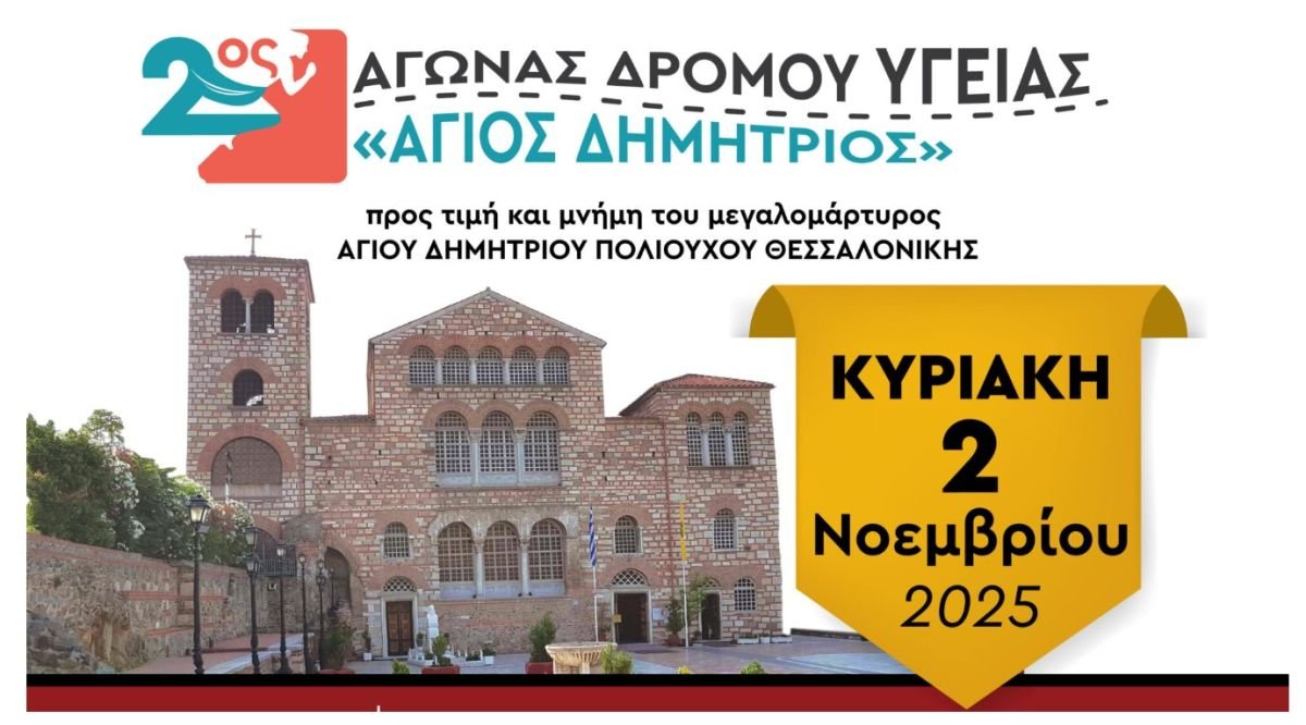 Από την Ιερά Μητρόπολη Θεσσαλονίκης ανακοινώνεται, ότι υπό την αιγίδα του Δήμου Θεσσαλονίκης, θα διεξαχθεί ο «2ος ΑΓΩΝΑΣ ΔΡΟΜΟΥ ΥΓΕΙΑΣ “ΑΓΙΟΣ ΔΗΜΗΤΡΙΟΣ”» προς τιμή του Πολιούχου της πόλης μας, μεγαλομάρτυρος Αγίου Δημητρίου του Μυροβλύτου.