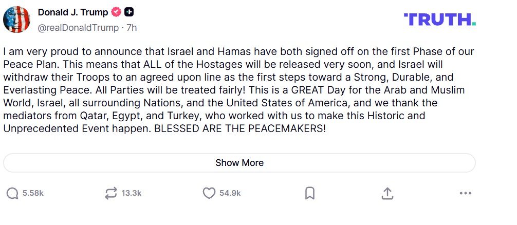 «Είμαι πολύ υπερήφανος που ανακοινώνω ότι το Ισραήλ και η Χαμάς ενέκριναν και οι δύο την πρώτη φάση του ειρηνευτικού μας σχεδίου», δήλωσε ο Τραμπ μέσω Truth Social.