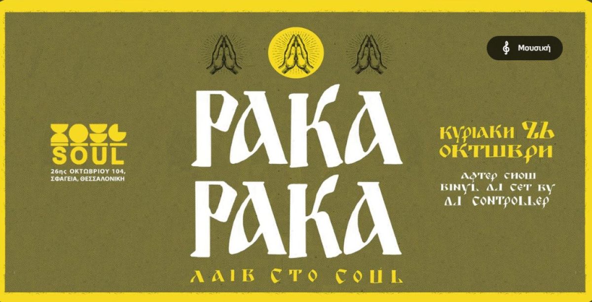 Την Κυριακή 26 Οκτωβρίου 2025 οι Paka Paka, συγκρότημα από τη Θεσσαλονίκη που παίζει χορευτική ηλεκτρονική μουσική, επιστρέφουν στη σκηνή του Soul. Την οπτική εμπειρία θα αναλάβει ο σχεδιαστής φωτισμού Νίκος Lopez Κεχαγιάς.