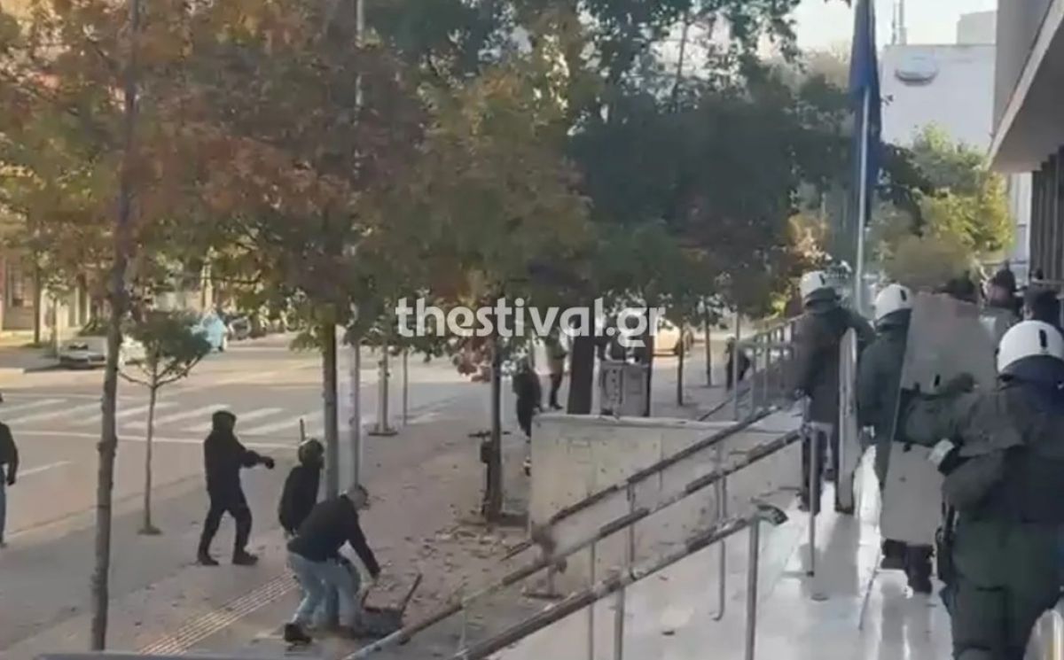 Ομάδα ατόμων με καλυμμένα πρόσωπα κινήθηκε προς την είσοδο του κτιρίου από την οδό 26ης Οκτωβρίου και εκτόξευσε αντικείμενα προς άτομα που βρίσκονταν στα σκαλιά.