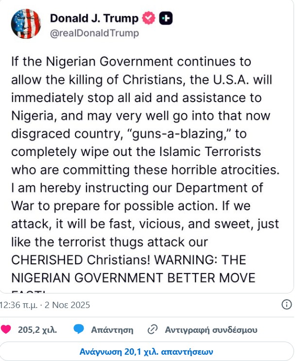 Σε ανάρτησή του το Σάββατο, ο Τραμπ ανέφερε ότι ζήτησε από το Υπουργείο Άμυνας – όπως το αποκάλεσε – να βρίσκεται σε «κατάσταση ετοιμότητας για δράση». Προειδοποίησε επίσης ότι οι ΗΠΑ ενδέχεται να παγώσουν κάθε οικονομική βοήθεια προς τη Νιγηρία, αν δεν ληφθούν άμεσα μέτρα προστασίας. «Αν επιτεθούμε, θα είναι γρήγορα, σκληρά και αποφασιστικά, όπως οι τρομοκράτες επιτίθενται στους Χριστιανούς», έγραψε χαρακτηριστικά.