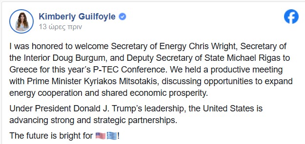 «Είχα την τιμή να καλωσορίσω στην Ελλάδα τον Υπουργό Ενέργειας Chris Wright, τον Υπουργό Εσωτερικών Doug Burgum και τον Αναπληρωτή Υπουργό Εξωτερικών Michael Rigas για το φετινό Συνέδριο P-TEC. Πραγματοποιήσαμε παραγωγική συνάντηση με τον Πρωθυπουργό Κυριάκο Μητσοτάκη, συζητώντας ευκαιρίες διεύρυνσης της ενεργειακής συνεργασίας και κοινής οικονομικής ευημερίας. Υπό τον Πρόεδρο Donald J. Η ηγεσία του Τραμπ, οι Ηνωμένες Πολιτείες προωθούν ισχυρές και στρατηγικές συνεργασίες», καταλήγει στην ανάρτησή της η Κίμπερλι Γκιλφόιλ.