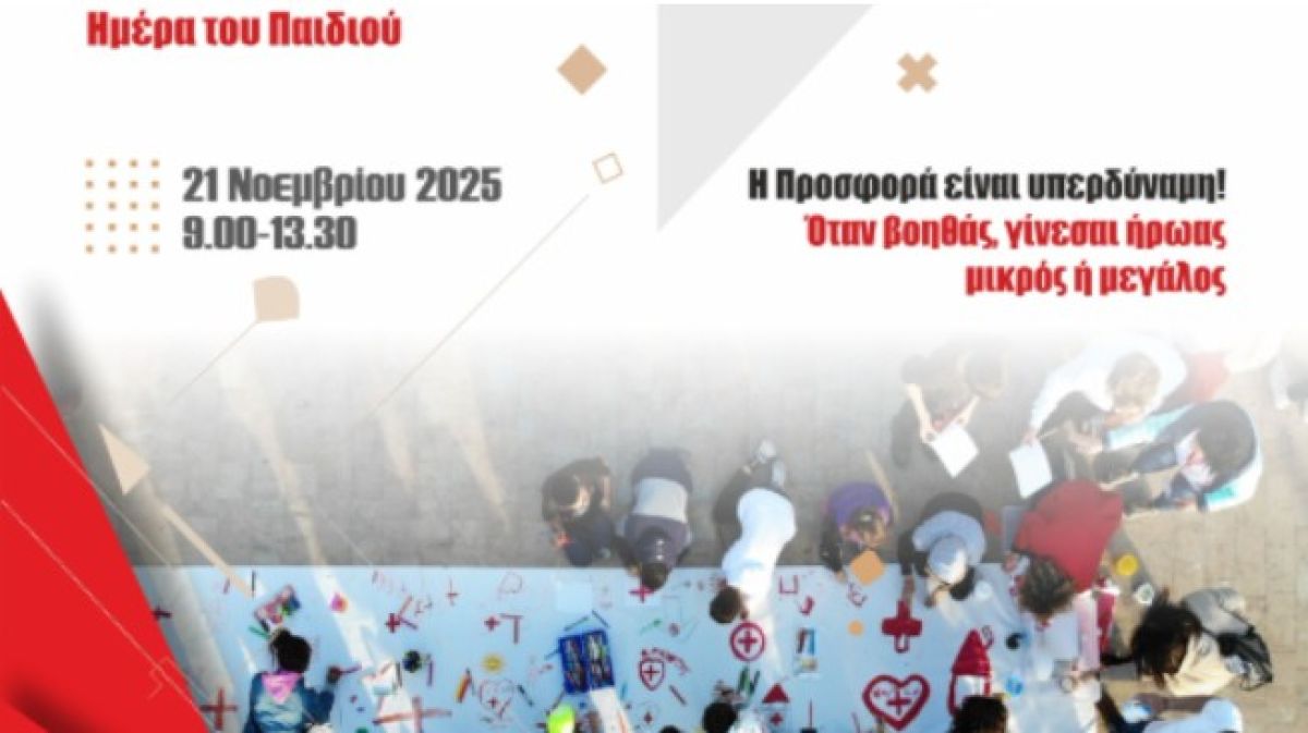 Την Παγκόσμια Ημέρα του Παιδιού θα τιμήσει φέτος το Περιφερειακό Τμήμα Θεσσαλονίκης του Ελληνικού Ερυθρού Σταυρού μέσα από μια ιδιαίτερη δράση: την «Αποστολή Προσφοράς», μια διαδραστική και βιωματική εκδήλωση που θα πραγματοποιηθεί σήμερα Παρασκευή 21 Νοεμβρίου 2025, από τις 9.00 το πρωί έως τις 13:30 το μεσημέρι, στην Αίθουσα «Μανόλης Αναγνωστάκης» του Δημαρχιακού Μεγάρου Θεσσαλονίκης.