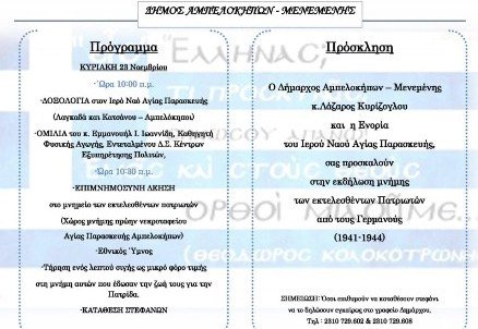 Ο Δήμος Αμπελοκήπων-Μενεμένης σας προσκαλεί να τιμήσετε με την παρουσία σας τη δοξολογία που θα πραγματοποιηθεί στον Ιερό Ναό Αγίας Παρασκευής Αμπελοκήπων, την Κυριακή 23 Νοεμβρίου, για να μνημονεύσουμε τους πατριώτες που εκτελέστηκαν κατά τη διάρκεια της Γερμανικής Κατοχής. Η εκδήλωση αποτελεί μια ιστορική αναφορά στη θυσία τους και μια ευκαιρία για συλλογική τιμή και μνήμη.