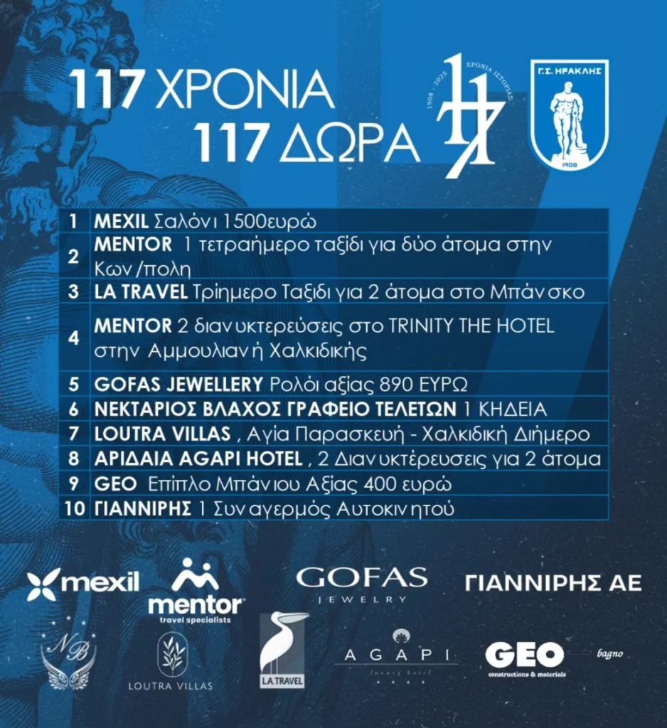 Ο Ηρακλής συμπληρώνει 117 χρόνια ζωής και θα τα γιορτάσει το βράδυ της Τετάρτης (26/11) στον ετήσιο χορό του συλλόγου, όπου θα γίνει και η κλήρωση για τα 117 δώρα που θα μοιραστούν.