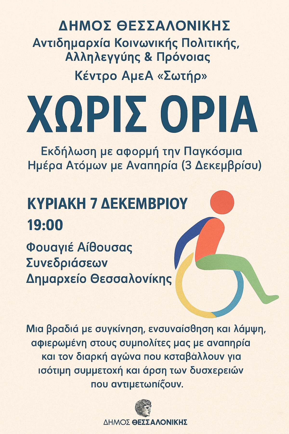 Ο Δήμος Θεσσαλονίκης, η Αντιδημαρχία Κοινωνικής Πολιτικής, Αλληλεγγύης & Πρόνοιας και το Κέντρο ΑμεΑ «Σωτήρ» διοργανώνουν σήμερα την εκδήλωση «Χωρίς Όρια», στο πλαίσιο της Παγκόσμιας Ημέρας Ατόμων με Αναπηρία (3 Δεκεμβρίου).