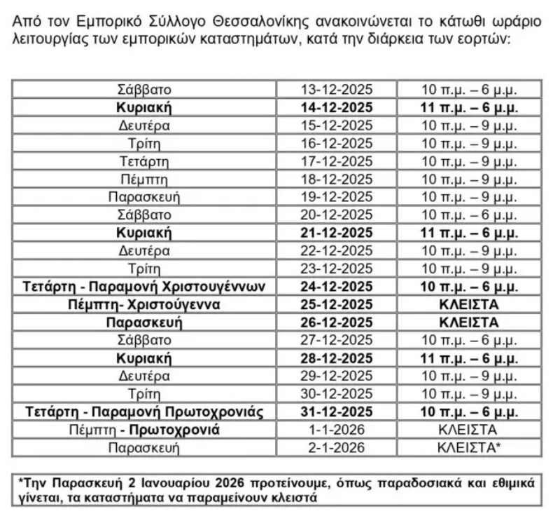 Σύμφωνα με τον Εμπορικό Σύλλογο Θεσσαλονίκης, τα καταστήματα θα παραμείνουν ανοιχτά τις Κυριακές 14, 21 και 28 Δεκεμβρίου, από τις 11:00 το πρωί έως τις 18:00 το απόγευμα.