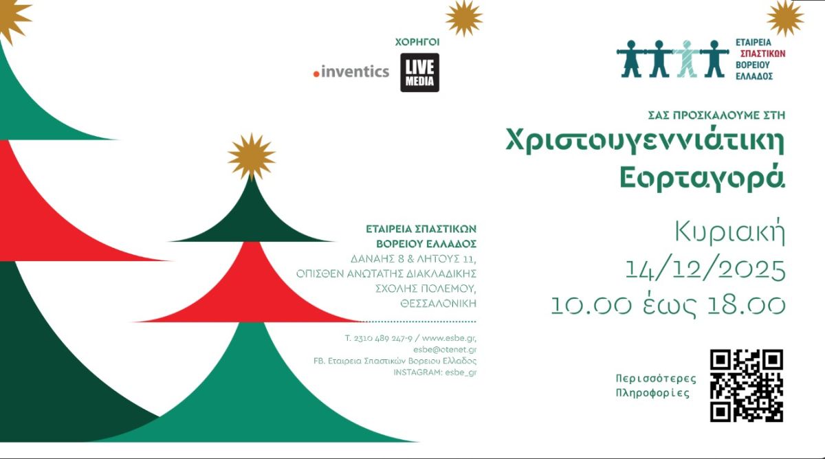 Μια γιορτινή πρωτοβουλία με έντονο κοινωνικό χαρακτήρα πραγματοποιεί σήμερα, Κυριακή 14 Δεκεμβρίου 2025, η Εταιρεία Σπαστικών Βορείου Ελλάδος, διοργανώνοντας χριστουγεννιάτικο bazaar στις εγκαταστάσεις της στην Καλαμαριά Θεσσαλονίκης.