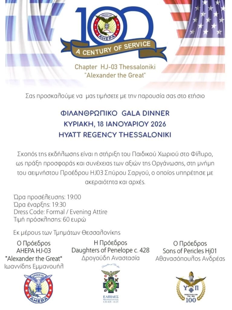 Η AHEPA HJ-03, οι Daughters of Penelope CH. 428 και οι Sons of Pericles HJ01, προσκαλούν τους φίλους και υποστηρικτές τους να συμμετάσχουν στο ετήσιο Φιλανθρωπικό GALA Dinner, που θα πραγματοποιηθεί την Κυριακή 18 Ιανουαρίου 2026, στο Hyatt Regency Thessaloniki.