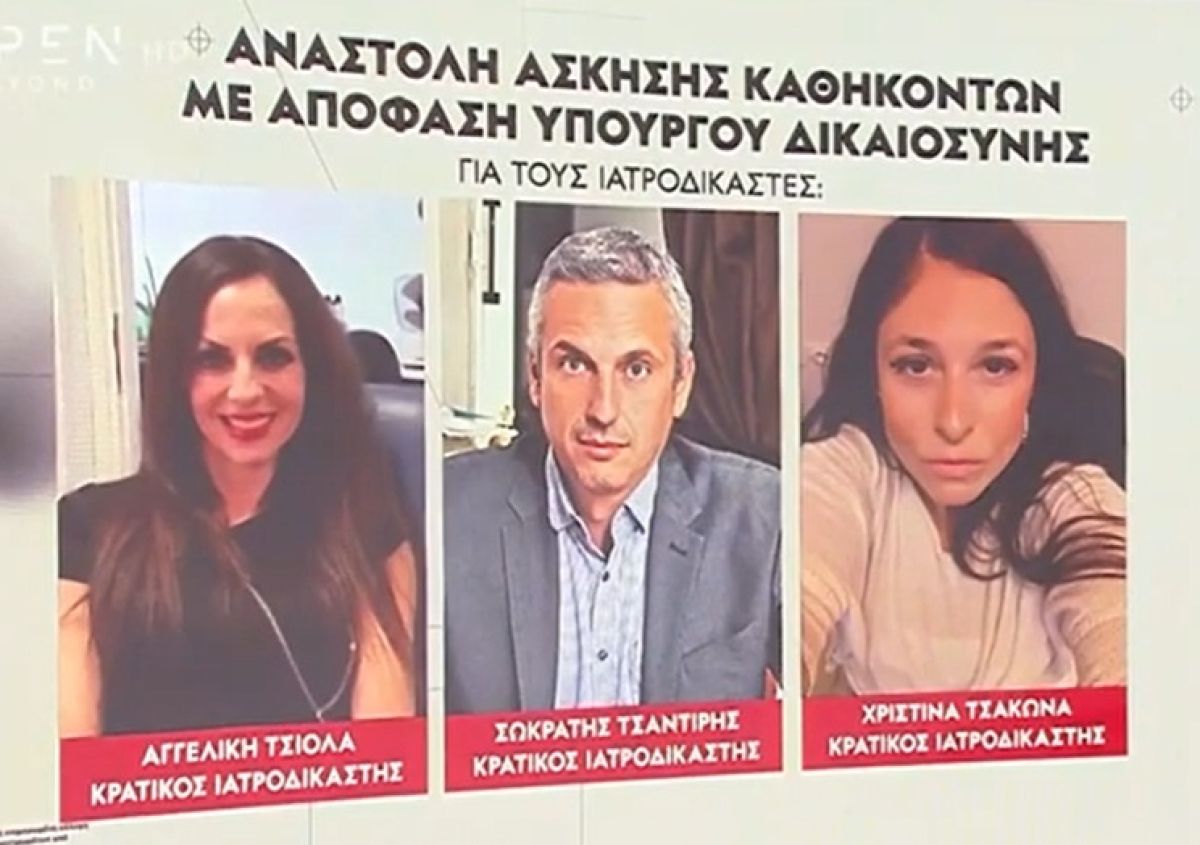 Η απόφαση αφορά τους τρεις κρατικούς ιατροδικαστές: Χριστίνα Τσάκωνα, Αγγελική Τσιόλα και Σωκράτη Τσαντίρη.