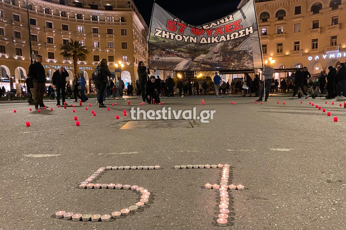 Λίγο μετά τις 21:00 άφησαν αναμμένα κεριά στην πλατεία Αριστοτέλους που σχημάτιζαν τον αριθμό 57, όσοι και οι νεκροί από τη σύγκρουση των αμαξοστοιχιών, και παρέμεναν σιωπηλοί στο σημείο. Παράλληλα ύψωσαν πανό που ανέγραφε το μήνυμα «Δεν Ξεχνώ- 57 ψυχές ζητούν δικαίωση» και πλακάτ στη μνήμη του Νικήτα Καραθεοδώρου που έχασε τη ζωή του στο δυστύχημα των Τεμπών.