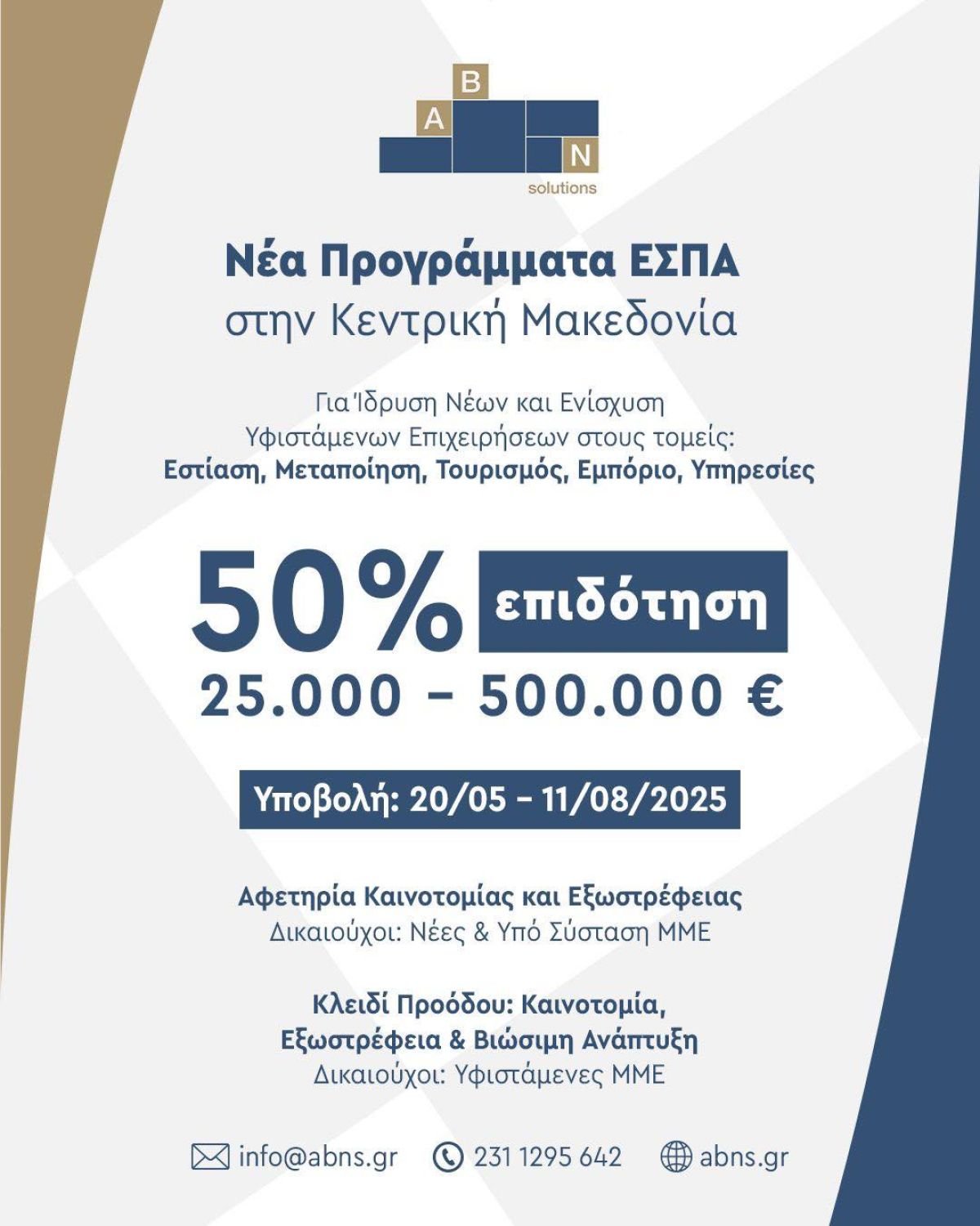 ΕΣΠΑ ΚΕΝΤΡΙΚΗ ΜΑΚΕΔΟΝΙΑ: Κλειδί προόδου: Καινοτομία, Εξωστρέφεια & Βιώσιμη Ανάπτυξη | Επιδότηση 50% των υφιστάμενων επιχειρήσεων