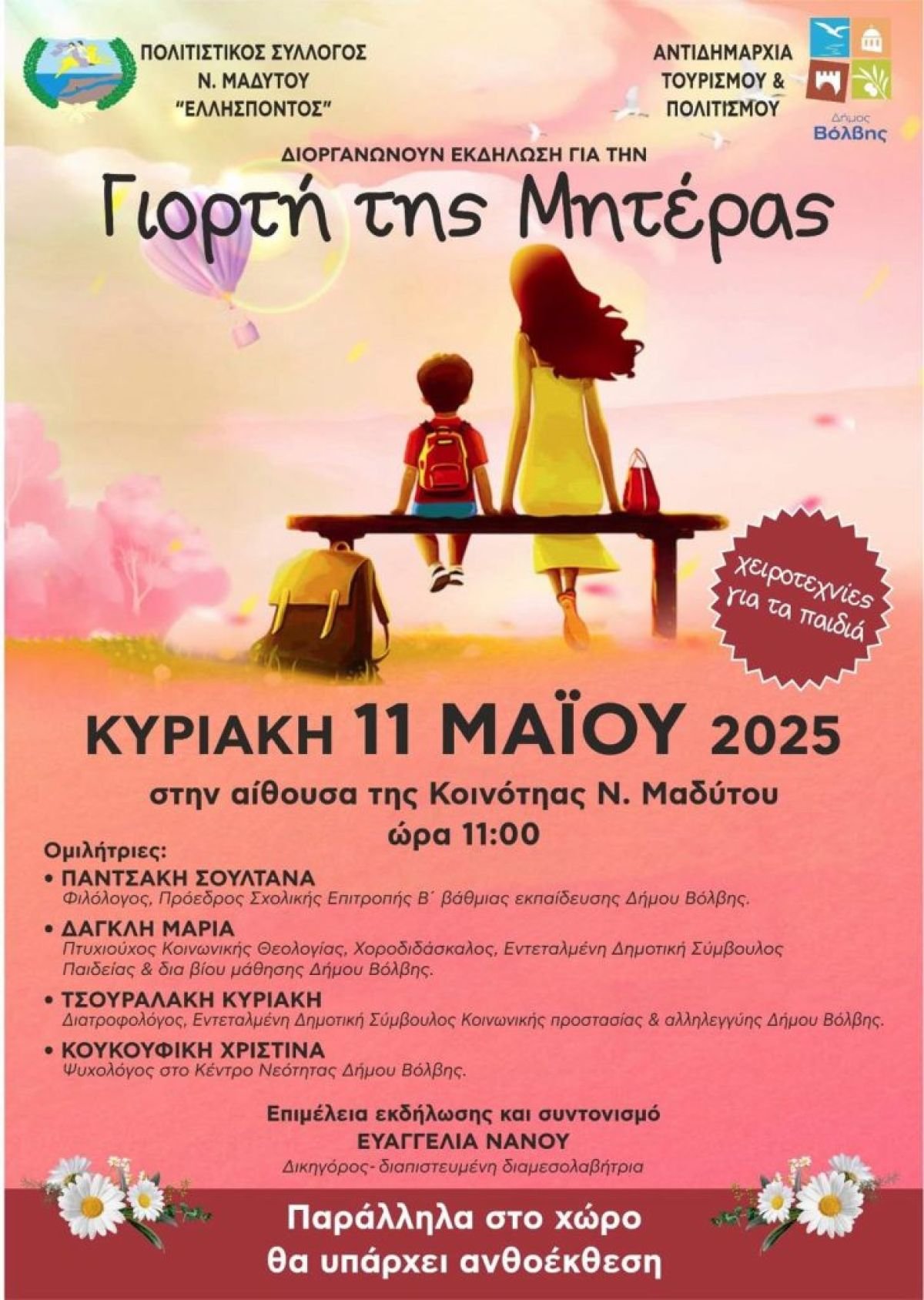 Τη Γιορτή της Μητέρας τιμά ο Δήμος Βόλβης και ο Πολιτιστικός Σύλλογος Νέας Μαδύτου, με μια εκδήλωση πλαισιωμένη από λουλούδια