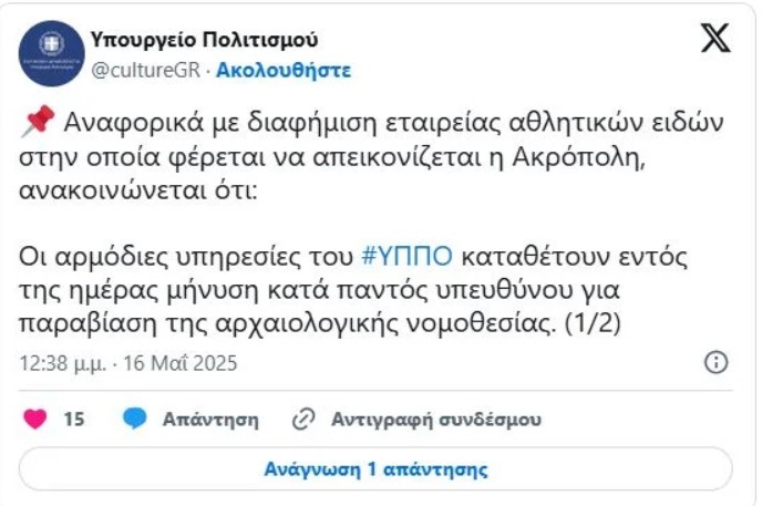 Σε ανακοίνωσή του, το υπουργείο αναφέρει: Οι αρμόδιες υπηρεσίες του υπουργείου Πολιτισμού καταθέτουν εντός της ημέρας μήνυση κατά παντός υπευθύνου για παραβίαση της αρχαιολογικής νομοθεσίας. Επιπλέον το Υπουργείο είναι σε επικοινωνία με την Υπηρεσία Πολιτικής Αεροπορίας, προκειμένου να διερευνηθεί η τήρηση ή μη της διαδικασίας αδειοδότησης της υπερπτήσης drone, σύμφωνα με την κείμενη νομοθεσία.